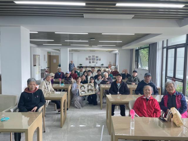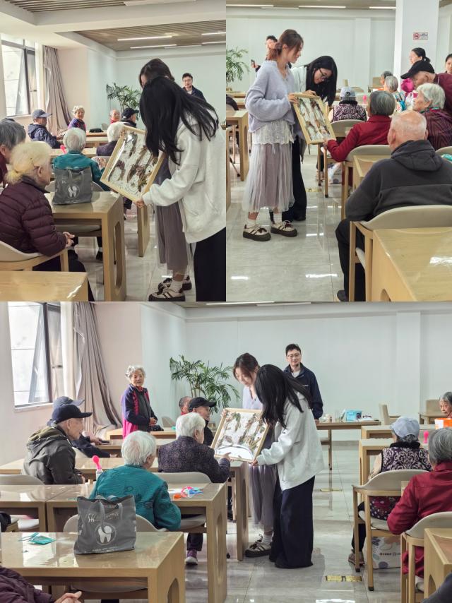 同学们小心翼翼地捧着装裱好的画作,走到老人身边,轻声细语地讲解。那一双双布满皱纹的手,偶尔轻轻指向画作,仿佛在与年轻的创作者们进行一场跨越岁月的艺术交流。在这个充满敬老温情的节日里,这些画作成了连接代际的桥梁。